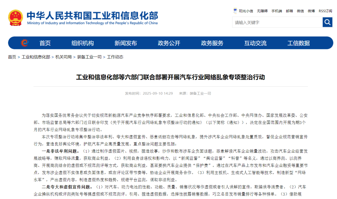 据工信部官网9月10日音问,为落实国务院常务会议对于切实程序新能源汽车产业竞争次第部署条件,工业和信息化部、中央社会责任部、中央网信办、国度发展编削委、公安部、市集监管总局等六部门近日集合印发《对于开展汽车行业汇注乱象专项整治行动的见知》(以下简称《见知》),决定在天下边界内开展为期3个月的汽车行业汇注乱象专项整治行动。
